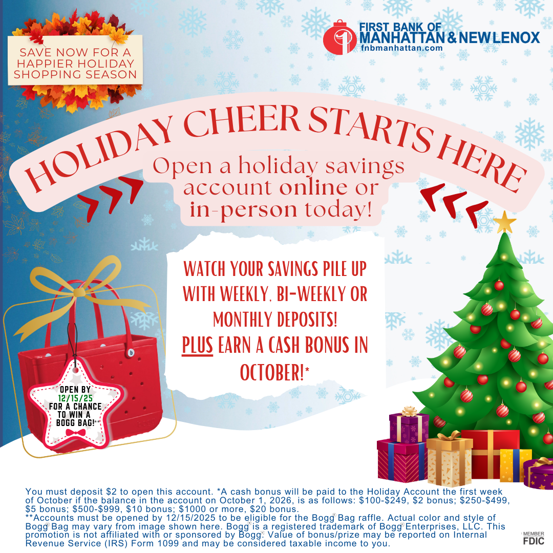 With our Holiday Savings Club account, you can earn interest while you save for the season of giving. Watch your savings grow with weekly, bi-weekly, or monthly transfers that you can set up with our online banking or mobile app.
